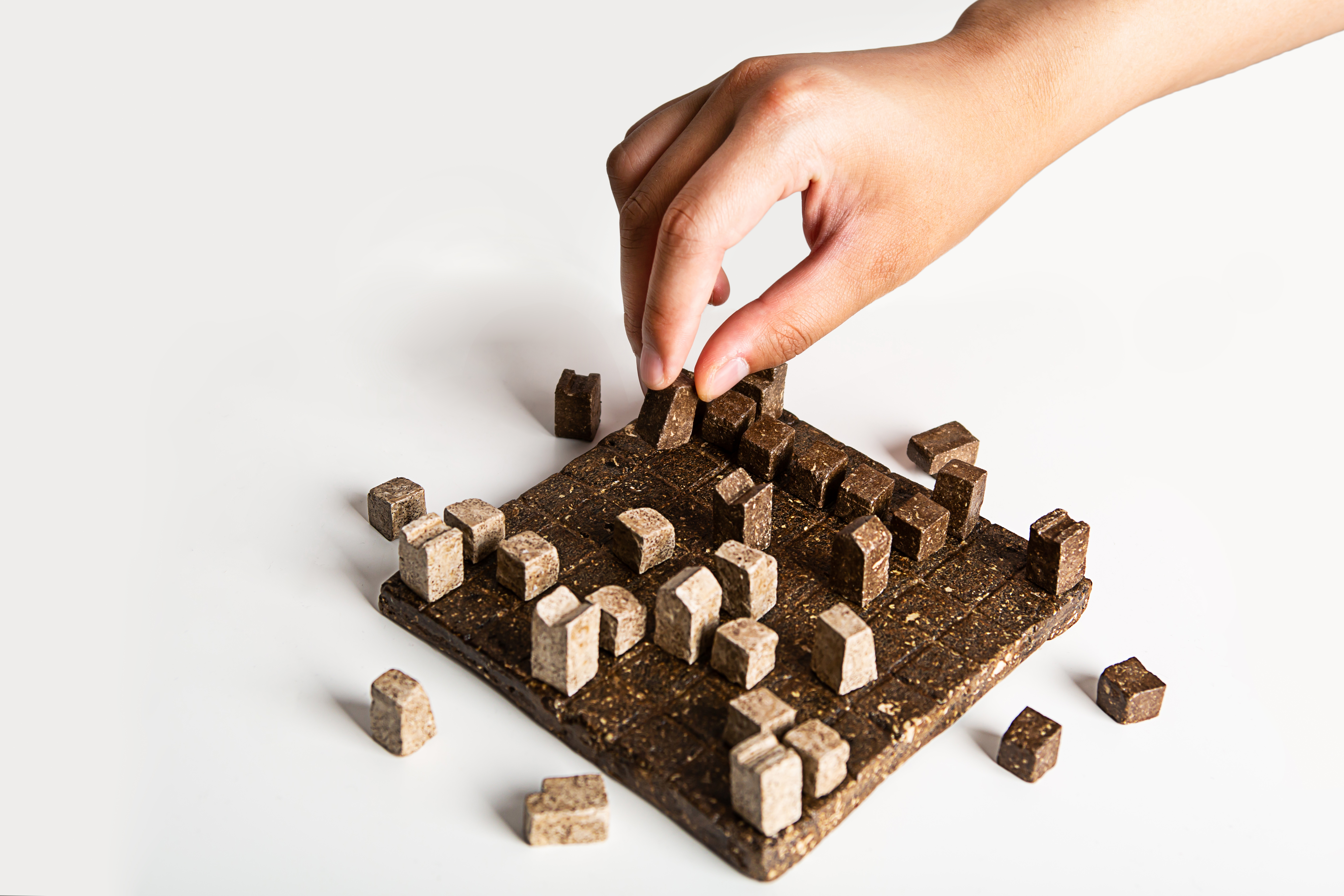 This work is a modern chess set made by mixing coffee clay and clay. The utilization as a prop is very high and there is an air purification effect due to the characteristics of the coffee itself, so the utilization as a prop is very good.